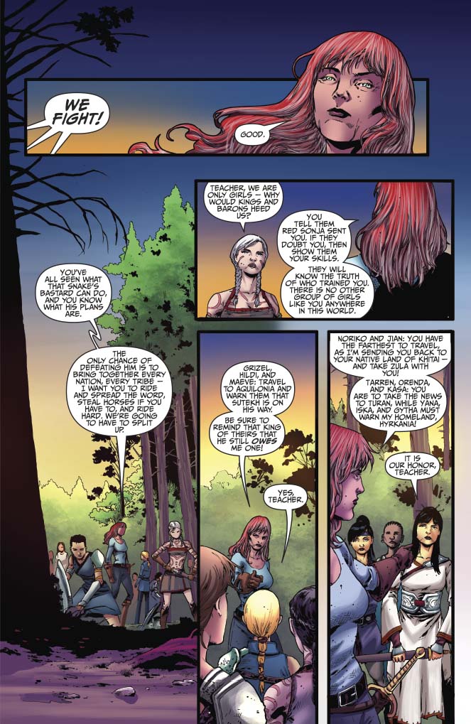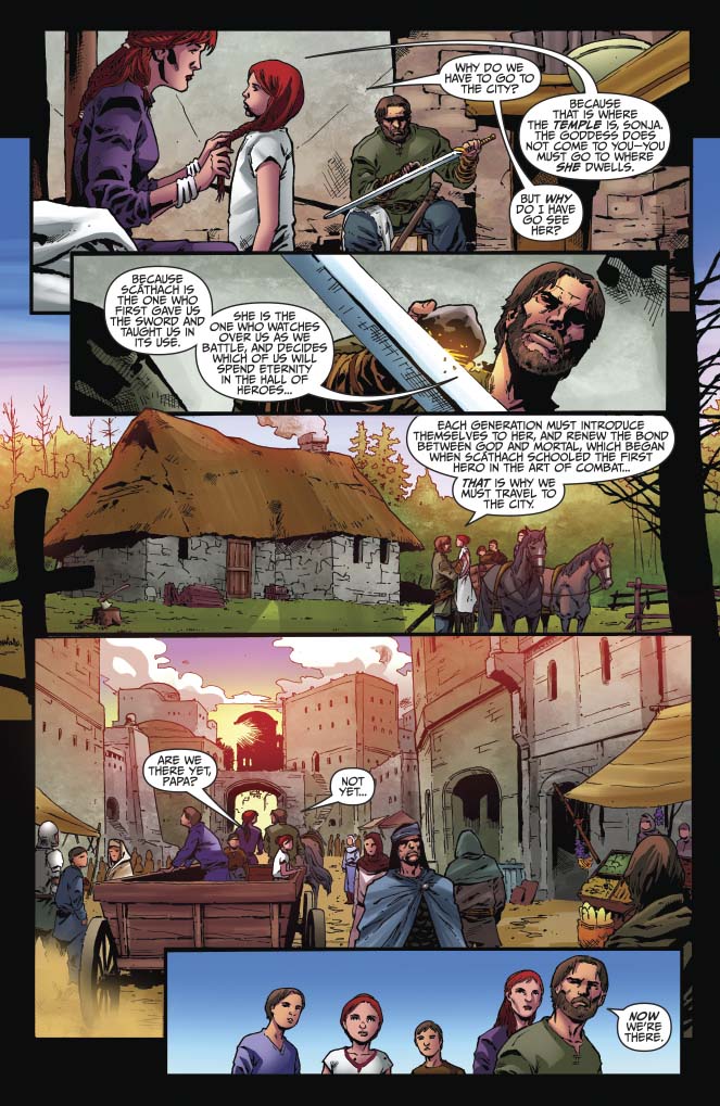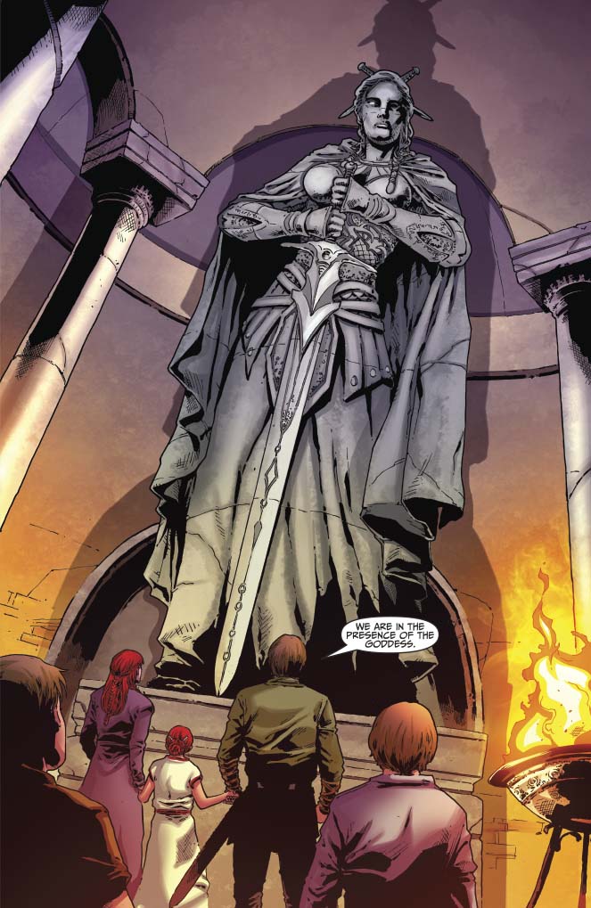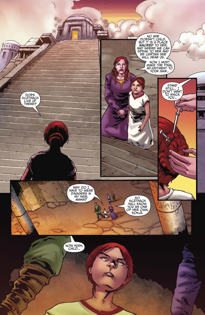 Following the aftermath of Sutekh’s siege of her school, Red Sonja travels to the fabled God Caves, where the barrier between the mortal world and those of the gods intersect, in hopes of contacting Scathach, the ancient battle-goddess of her ancestors. But is she willing to pay the Queen of Swords’ price for her divine help?